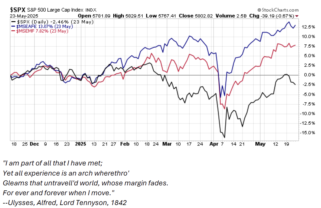 OK, but what might be the catalyst to not only potentially drive sustained U.S. dollar weakness relative to global currencies going forward but also provide justifiable fundamental support beyond simply valuations for non-U.S. stocks to start meaningfully outperforming the U.S. for a sustained period?